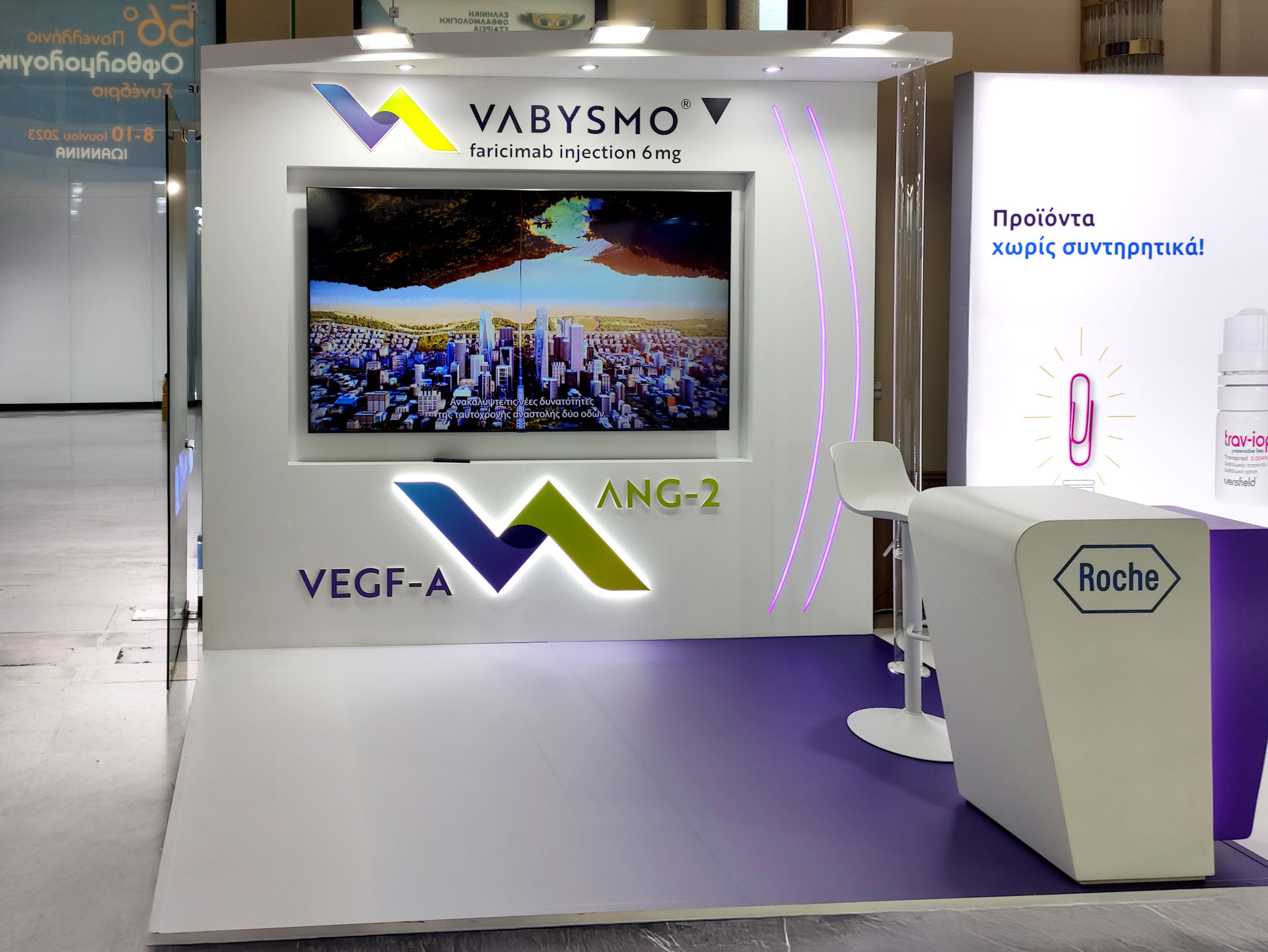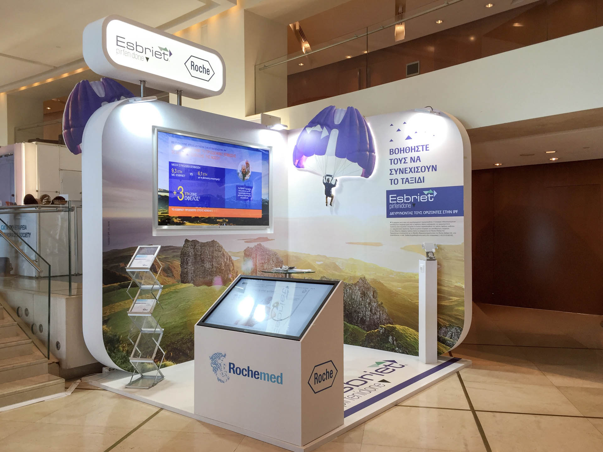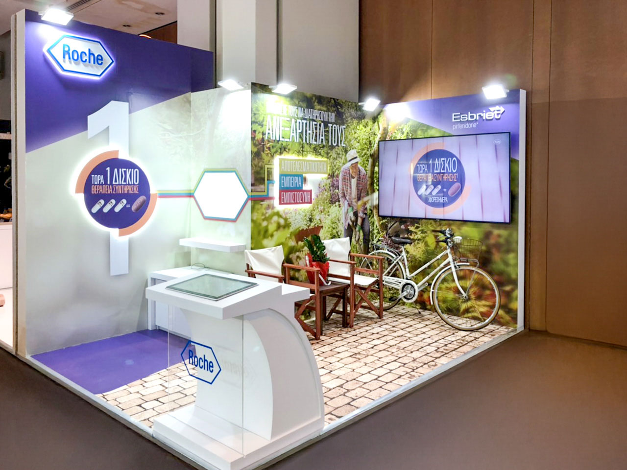 Η Plouto σχεδίασε και κατασκεύασε συνεδριακό περίπτερο για την Roche, δίνοντας προτεραιότητα στην ευκρινή τοποθέτηση μηνυμάτων, στην εργονομία υποδοχής/συναντήσεων και στη φορητότητα/ταχεία εγκατάσταση για συνέδρια.